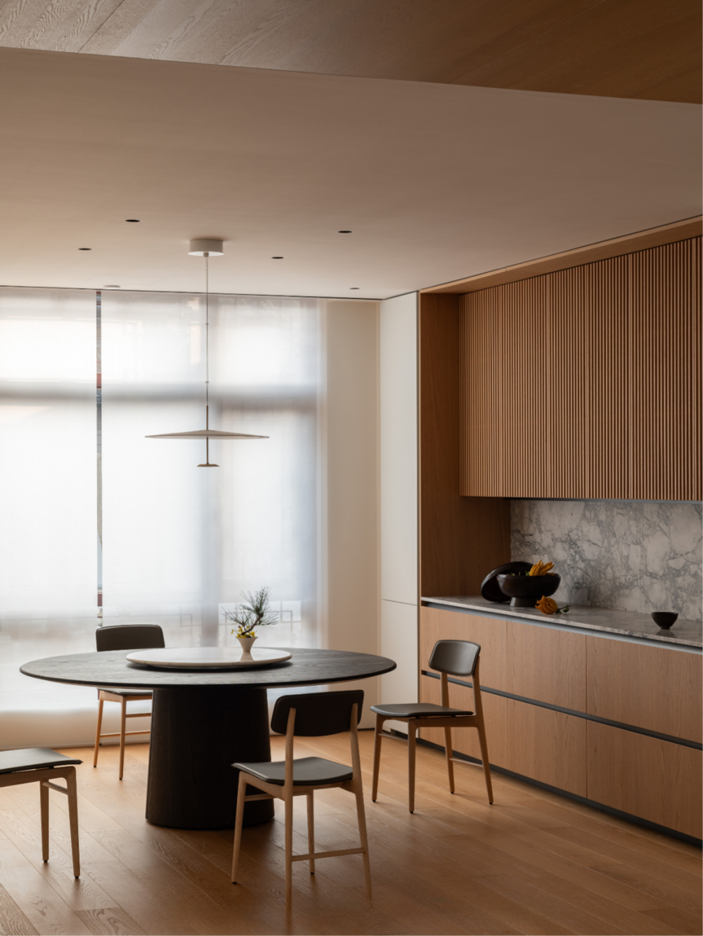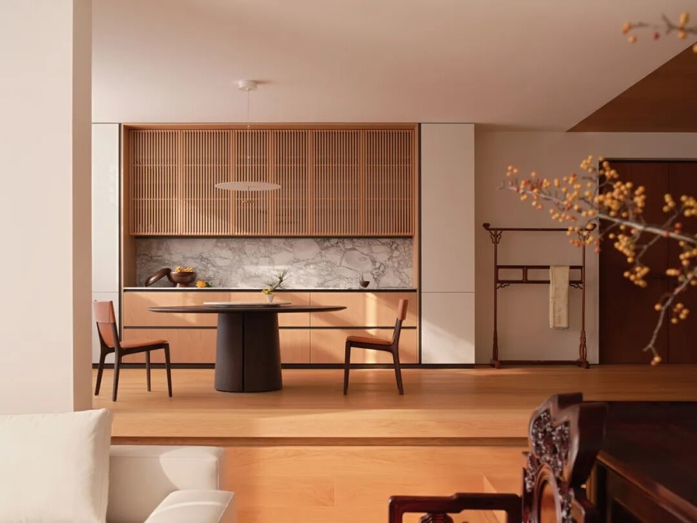 晨光微熹时分,薄雾如素绢般轻笼庭院,意大利Molteni&C的沙发与明式条案在朦胧中静默对望。下沉式客厅以微妙的高差,将人的视线自然引向落地窗外的园林景致,玻璃窗外太湖石的纹理,翠竹黄花,皆是身体与空间的对话。 餐厅的边柜与圆桌同样来自于Molteni&C,优雅而简洁的线条含蓄地实现了空间所需的功能。待晨雾散去,光影渐次变化,空间化作立体山水卷轴,人在其中行走,捕捉着瞬息即逝的自然。