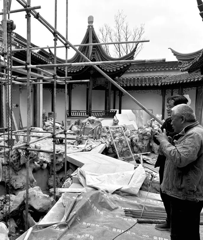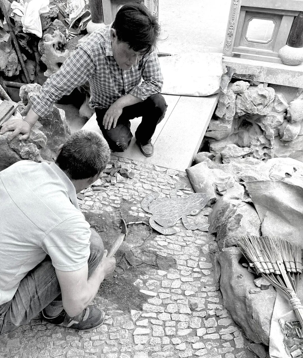 院子里的地铺也是他介绍的老石匠,70多岁了,带着一帮人一起做。新买的石头匠人们称之为“火气重”,需要在现场经过搅拌去火气。第一遍搅了20分钟,磨得太圆,第二遍磨了10分钟,最后又买了打磨片,全部打磨一遍,把毛刺感都打磨掉。 很多园林公司按图纸施工,做出来像是”预制菜“。老石匠们可能没有图纸,但沿用着一代代造园传下来的图稿,用手一点点堆叠出来,有了真正的人的温度和感觉。