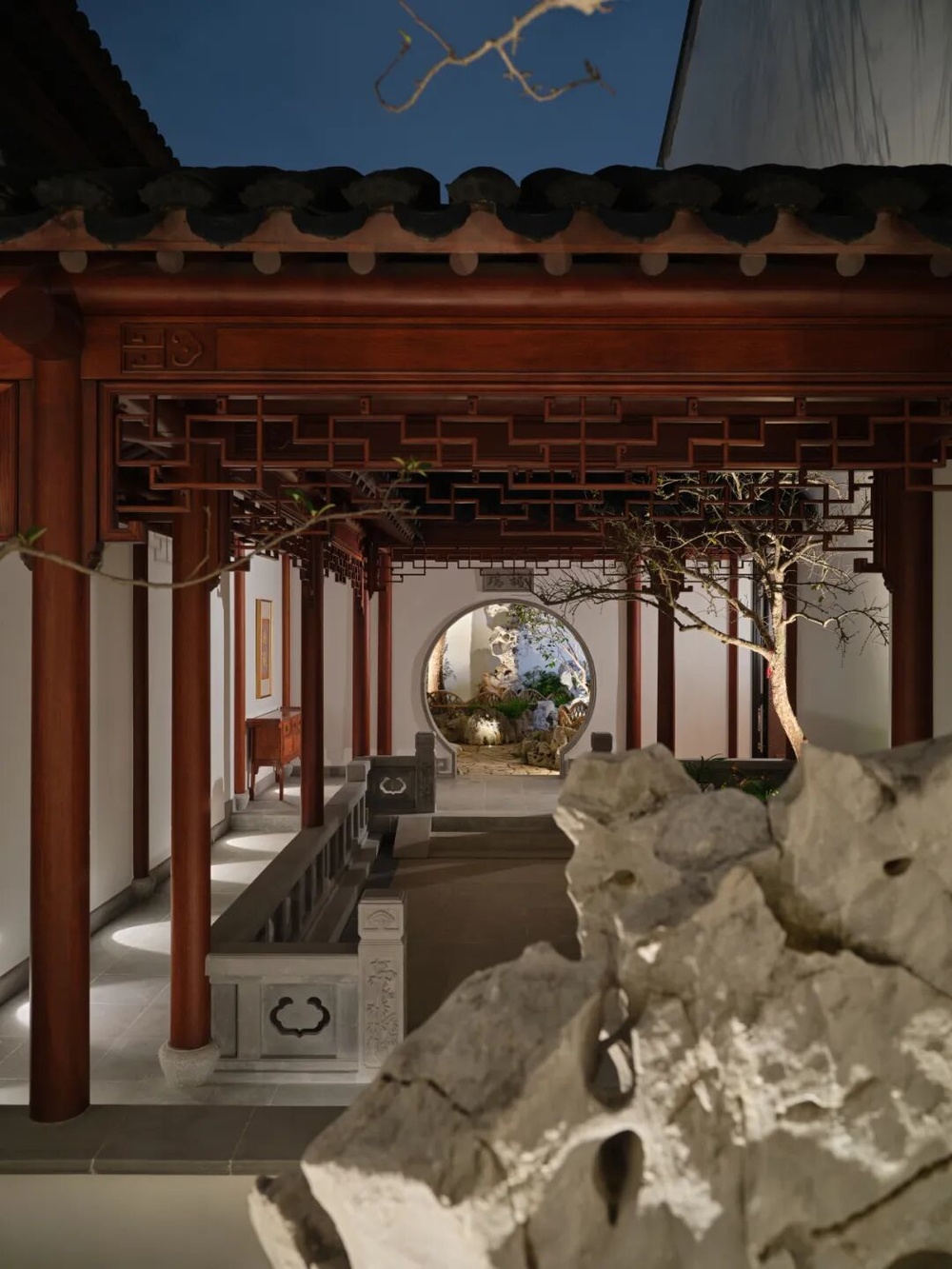 在南宋的山水画中,马远、夏圭擅留白,笔少意多。西方建筑大师密斯创造了极简主义空间,强调“少即是多”。二者手法上有相似之处,内核却不尽相同。东方的“留白”是无我的状态,天地空阔而苍茫,西方建筑以人参与空间而获得丰富的感知。 张海华将文化作为一个整体来思考,他希望创造出具有国际化精神的作品。窗户是室内外的分界点,白天光影在室内形成动态的江南水墨画,室内的极简主义犹如美术馆;夜晚室内灯光明亮,户外庭园深深,从院子向内看,又像是一个意大利生活方式的美术馆落在东方园林中。
