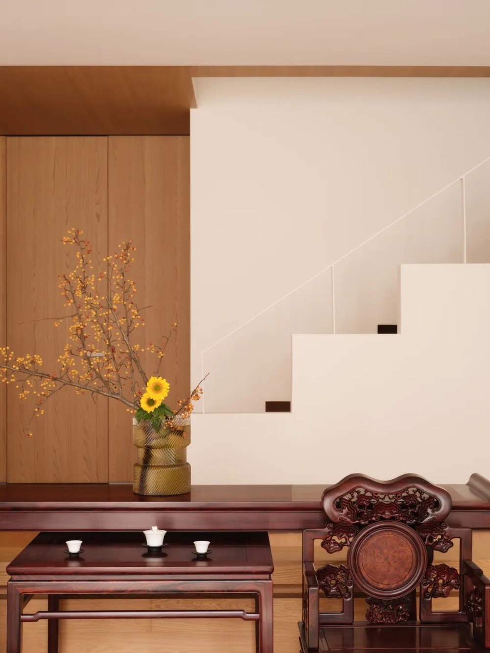 设计师在空间里隐藏了一条视觉中轴线,从户外庭院的假山及假山背后的文字书条石,递进到客厅南侧的两根阵列的柱子,到中堂太师椅和条案,再递进至楼梯,暗含了江南传统大宅的中轴线递进关系,也是儒家文化的表达。