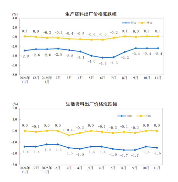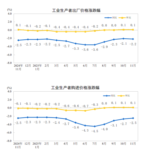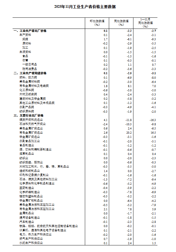 发表时间:2025-12-10 10:46来源:中国新闻网 中新网12月10日电 据国家统计局网站消息,2025年11月份,全国工业生产者出厂价格同比下降2.2%,工业生产者购进价格同比下降2.5%;工业生产者出厂价格和购进价格环比均上涨0.1%,涨幅均与上月相同。1—11月平均,工业生产者出厂价格比上年同期下降2.7%,工业生产者购进价格下降3.1%。 ![]() 图片来源:国家统计局网站截图 一、工业生产者价格同比变动情况 11月份,工业生产者出厂价格中,生产资料价格下降2.4%,影响工业生产者出厂价格总水平下降约1.79个百分点。其中,采掘工业价格下降6.1%,原材料工业价格下降2.9%,加工工业价格下降1.9%。生活资料价格下降1.5%,影响工业生产者出厂价格总水平下降约0.38个百分点。其中,食品价格下降1.5%,衣着价格下降0.3%,一般日用品价格上涨1.1%,耐用消费品价格下降3.6%。 ![]() 图片来源:国家统计局网站截图 工业生产者购进价格中,燃料动力类价格下降6.9%,建筑材料及非金属类价格下降5.8%,化工原料类价格下降5.0%,农副产品类价格下降4.9%,黑色金属材料类价格下降3.0%,纺织原料类价格下降1.9%;有色金属材料及电线类价格上涨8.1%。 二、工业生产者价格环比变动情况 11月份,工业生产者出厂价格中,生产资料价格上涨0.1%,影响工业生产者出厂价格总水平上涨约0.08个百分点。其中,采掘工业价格上涨1.7%,原材料工业价格下降0.2%,加工工业价格上涨0.1%。生活资料价格持平。其中,食品价格下降0.1%,衣着价格上涨0.1%,一般日用品价格上涨0.2%,耐用消费品价格下降0.2%。 工业生产者购进价格中,有色金属材料及电线类价格上涨1.8%,建筑材料及非金属类价格上涨0.2%,燃料动力类价格上涨0.1%;化工原料类价格下降0.6%,农副产品类、纺织原料类价格均下降0.3%,黑色金属材料类价格下降0.2%。 ![]() 图片来源:国家统计局网站截图 |