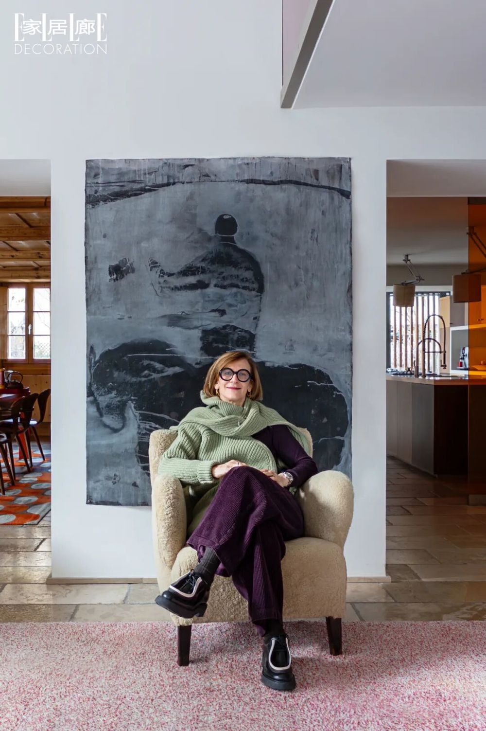 餐厅一隅, 这是原建筑中少数保留完好的房间, 也是当年唯一的采暖生活空间,称为pèle, (法国萨沃伊地区传统农舍中的糅合厨房、 餐厅和日常生活起居等多功能的房间) 通常为两层木结构, 底层抹灰泥, 上层则用于晾晒和储存干草。 餐椅为Norman Cherner设计, 双开门式木制餐柜为古董, 上方放置的一组摩洛哥绿釉烛台 与餐柜把手相互映衬, 色彩大胆的手工编织地毯 为空间增添了明快活泼的用餐氛围。 “我们不想要一座传统的小木屋,而是在尊重建筑自身历史的基础上打造出明亮而愉悦的现代家庭住宅。”Nathalie坦言,在农舍的整体设计中,素以实验精神著称的建筑师Christian Biecher,将其标志性的大胆用色手法发挥到了极致,而那间由农舍保留至今的“心脏”——pèle(拥有餐厅和日常起居等多功能的房间),也仿佛有了心跳与呼吸。