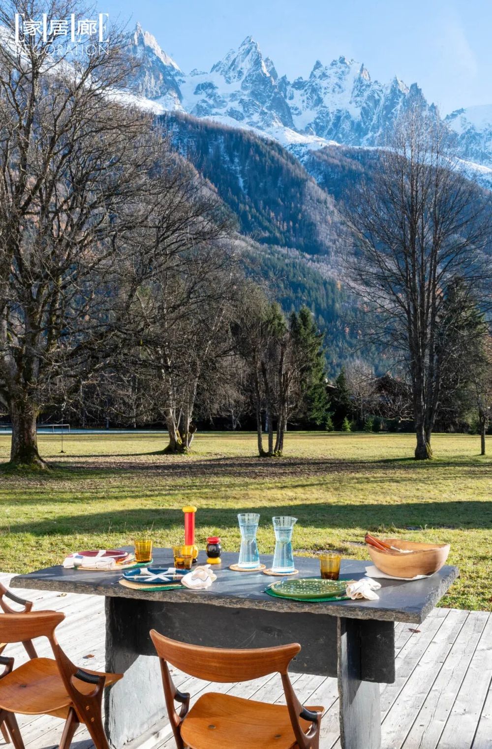 通往主卫的过道, 一扇被漆成红色的门, 极具视觉张力与戏剧性。 与此同时,她希望家是个充满奇思妙想的居所,主卫配有百叶面板的巨大落地窗,让随机不对称排布的彩色玻璃隔断折射出亮蓝色光芒,为百岁农舍赋予了前卫时髦的个性,又联想到窗外由万年冰层凝固成 “冰海”(Mer de Glace)。 最终,她看到了可以让身心依靠的空间,它糅合了历史传统与现代设计精神,见证季节在这里无声地更替,从绿荫环绕到银装素裹,简单的乐趣和山野的宁静会提醒她停下来,想一想自己的灵魂所需?或许能从冰川、雪峰和森林共同谱写的自然交响诗中找到答案。 |