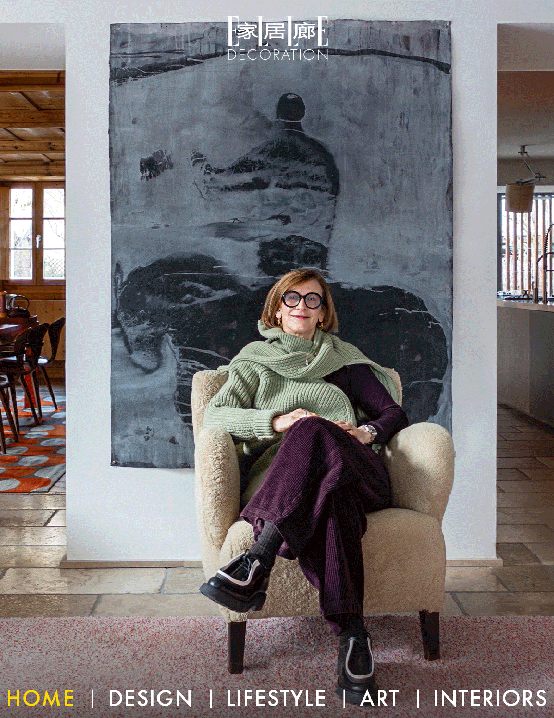 Nathalie站在客厅的拱形落地窗前, 此开口曾是马厩入口, 此后在改造过程被拆除; 窗外是被冰雪覆盖的阿尔卑斯山脉 与原始森林坡地共同描绘的壮丽风光, 改造后挑高两层的客厅, 让人能够更好地欣赏勃朗峰的美景。 她身后的四件套木制咖啡桌 来自意大利画廊, 上面陈列着一组 由Timo Sarpaneva设计的Iittala水晶烛台, 来自Galerie KRD。 步入屋内,眼前所见并非一个刻意打造的现代空间,而是彰显宁静、内省与和谐的“滋养灵魂的容器”:天然皮革沙发、敦实的木制咖啡桌、手工陶器散发出材料原有的光泽和纹理,物与物之间产生着能量共振,刻画出日积月累的居住痕迹。 起居空间温暖、舒适且充满诗意,充分彰显Nathalie所追求的“感性极简主义”设计哲学。森林和雪峰透过一扇拱型落地窗将大自然与客厅相连,米白、灰褐、橡木、陶土色、烟熏黑色调,营造出近乎冥想的氛围,光线在空间中缓慢地流动,随时间的变化雕刻出不同的质感和情绪。